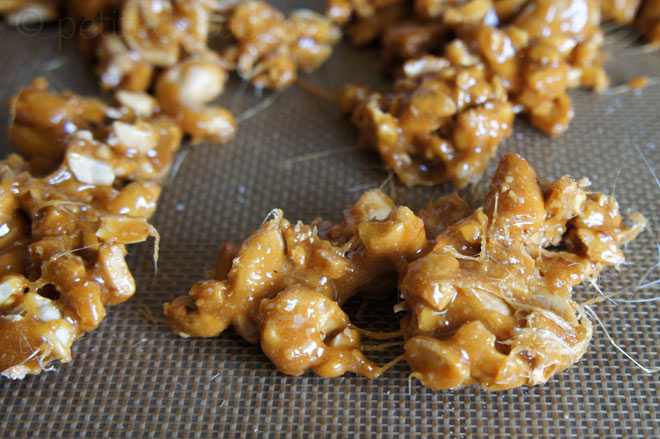 Place the sugar in a saucepan over med-low heat. Playing close attention, stir with a heat-resistant spatula. It should start melting and turning brown at the same time. Keep mixing and as soon as its all melted and caramel-colored and you can no longer see any white bits, remove from fire and immediately add the cashews, stirring to coat them evenly. (Work very very quickly; the cashews will bring down the temperature of the sugar making it go hard very fast.) Place them on your silicone mat and try to spread them out as separated as possible. Let cool completely.