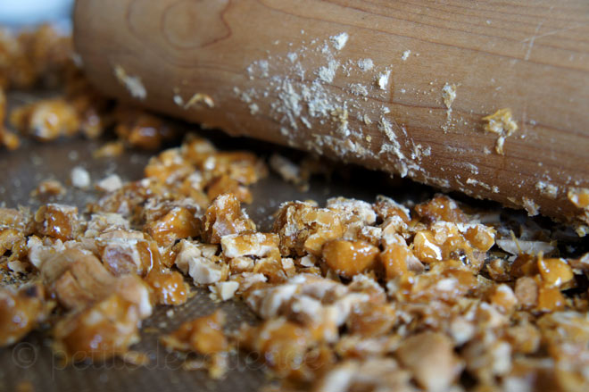 After your custard has chilled (mine was in the fridge for about 6 hours), take a rolling pin and crush half of your brittle to very small pieces, the kind you’d like to get in your ice cream. (Save the rest in big chunks for serving in an air-tight conainer.) Add the crushed brittle to the custard and immediately process in your ice-cream maker. Preferably when done, freeze overnight before serving.