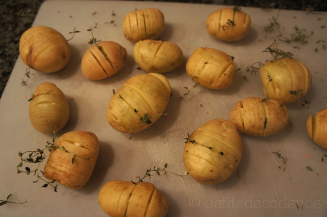 Preheat the oven to 415º F. Wash potatoes. Using a sharp paring knife, make thin slices (about 3 mm each) on your potatoes, taking care no to cut all the way down. (Err on the side of undercutting if you’re unsure, otherwise your potatoes will break). With your thumbs, open your potatoes as if you were trying to flip a book, to help the slices separate a little. As if you were “flossing” place the thyme sprigs in between the slices. Peel the garlic cloves and cut horizontally in half. Remove the green shoot part. Cut into very thin slices, and place a few in between the potatoes. Do the same with tiny amounts of butter. (a couple dabs per potato is enough). Place directly on a baking sheet and generously pour olive oil on, letting it go inside the potatoes. Season heavily with freshly ground pepper and seasalt. Bake for about 50 min – 1 hour, or until the tops are golden and crispy and the inside is tender.