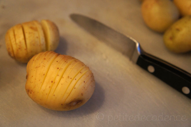 Imagine if we were all an ingredient; wouldn’t reaching our potential be so much easier?? I guess it would depend on which chef’s hands you found yourself in though… But all modesty apart, I think I helped these slightly old potatoes sitting in my vegetable drawer along their way to stardom. And I know, nothing, absolutely nothing, beats some good old gratin dauphinois, especially my mother’s on christmas eve, (because there really is nothing in the world that can compare to cream, cheese and soft warm potatoes all together next to a tender slice of turkey)  but this kind of baked potatoes, which are originally known as hasselback potatoes and are of swedish origin, are really high up there in the ladder of potatoes reaching for the stars. And that’s not only because they’re insanely delicious, crispy on the outside and soft on the inside, but because they’re also healthy (as far as healthy and potatoes can go together) and quick to make. The original version has breadcrumbs, tons of butter, and if I’m not mistaken, paprika. This version, however, is far simpler; thyme, teeny tiny bits of butter and garlic. That’s all you need. Really. Oh, and a sharp knife.