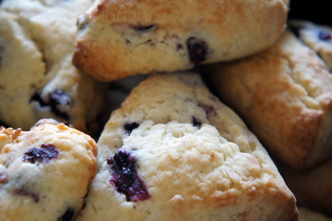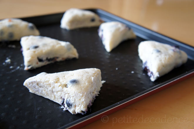The original recipe called for currants, but I substituted with blueberries, which where slightly crushed as I was forming the dough and gave the scones some moist and sweet purple spots. Read more for the recipe.