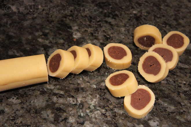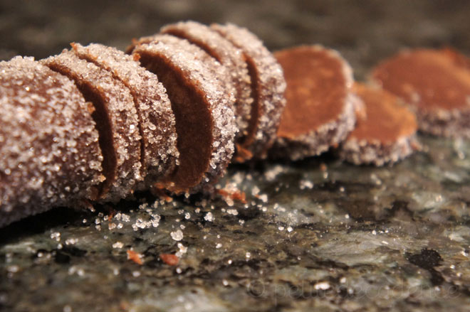 Sift together the flour, icing sugar and salt. (If you’re going for chocolate, add the cocoa powder) Place with the cubed butter in the bowl of your standard mixer and with the leaf attachment mix on med speed until it becomes crumbly and you can no longer see lumps of butter larger than a pea. Add the vanilla and milk and mix for 5-10 seconds more. Dump the mixture on your work surface an using the palm of your hand, rub the crumbly mixture softly against the marble, turning it into a dough. Try not to pass your hands over the same bit of dough more than twice, as this will both warm the butter and develop the gluten in your flour. Once you’ve formed a ball of dough, place it in the fridge for 5 to 10 minutes, to keep it from being too soft. Take it back out and form logs of about 4-5 cm. Once your logs are evenly shaped, place a good amount of sugar on the work surface, enough to cover the length of the logs. Brush the logs lightly with water, then roll them in the sugar. Be generous, and roll them twice if necessary. Place your logs in the freezer for 20 minutes. Using a sharp knife, cut the logs in 2 or 3 mm thick slices. (If they’re too soft for this, freeze them a bit longer). Arrange on baking sheets and let them thaw for 10 minutes, then bake until only slightly golden.