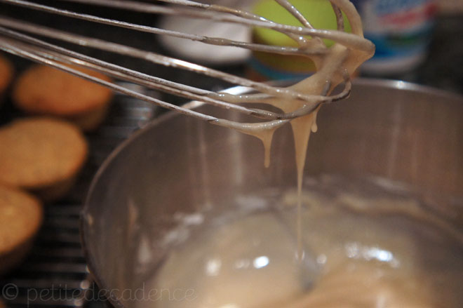 (Tip: I didn’t add any milk for a thicker glaze that would set harder on the muffins)