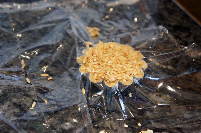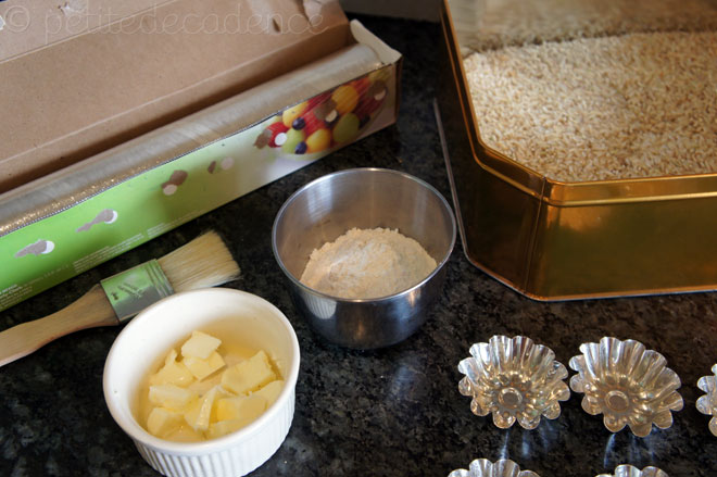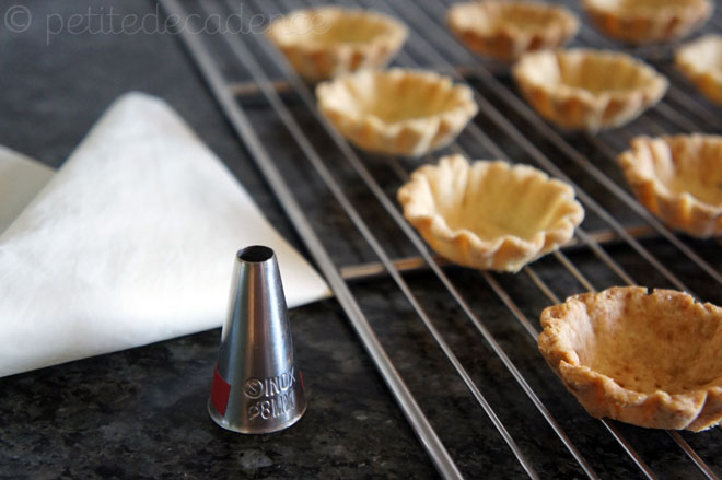 Using a strip of film paper at least 6 cm on each side bigger than your mold (don’t skimp on this, it’s way better to exaggerate as the film will shrink significantly in the oven), weigh down the tartlets by placing uncooked rice or beans over the film and then joining the ends of the film loosely, forming a sort of rice filled balloon on each tartlet (see photo). Bake until golden brown, remove from the oven, immediately remove the rice weights, and let stand about 3-5 minutes on the mold before transferring to a wire rack.