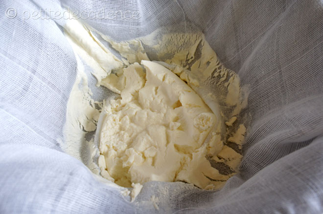 Carefully and without moving it much, transfer to a colander lined with cheesecloth. Tie the cheesecloth at the the ends and hang it somewhere it can drip for a long period of time (I use a long sturdy stick and place a bowl under it to collect the whey). Hang it anywhere between one hour to 8. The firmness of the cheese will depend on how long you let it drain. If you want it as a spread, do less time. If you want a firmer, more ricotta-like texture, go for the longer time. Once ready, transfer to a bowl. Crush the salt in a mortar and fold it into the cheese using a rubber spatula, making sure its evenly mixed. Store in the fridge for up to one week.