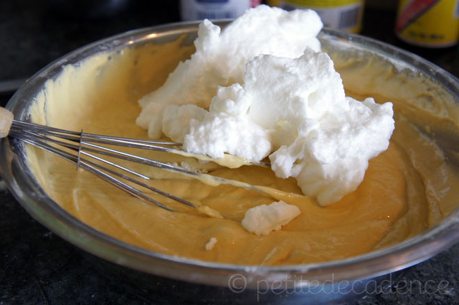 Whisk the egg whites until they form stiff peaks, separately, beat together the yolks and sugar. Add the flour and baking powder, beat well, add the milk and vanilla. Fold the egg whites in gently, using a rubber spatula. Transfer to the mold and bake for about 30 minutes, or until golden brown and the center of the cake is springy to the touch. Transfer to wire rack and let cool for 10-15 minutes.