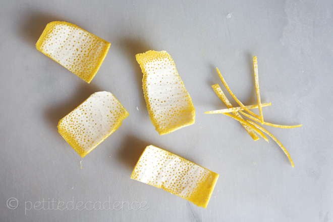 Meanwhile, bring a small pot of water to a boil. Place the orange rind julienne and let them simmer for about 5 minutes. Drain and rinse, twice, then place on a paper towel to dry.