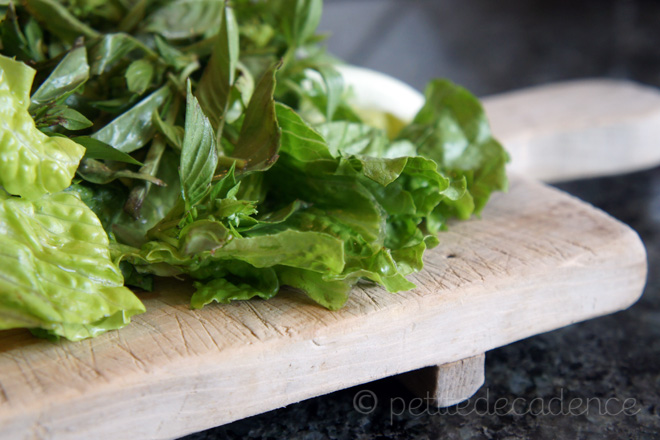 About a monday a month my mother decides she’s going to have a lifestyle change and become green and healthy, so she buys about 5 heads of lettuce, a case of eggs, yogurt, and nothing else. She then proceeds to eat the yogurt and stash the lettuce in the bottom most drawer of the fridge, along with her lifestyle change, which typically results in 4 1/2 heads of lettuce rotting and going to waste. Enter me, with a fresh bunch of basil, to reuse, reuse and recyle. Or actually, just use. (unless you count the extra space in the fridge as reducing) And by use I mean turning those green crunchy leaves into a delicious, light, creamy, peppery lettuce soup. The kind of soup that goes great before any meal and in any weather. And also the kind of soup you can make in about 15 minutes, and repeat the recipe with any kind of lettuce you have leftover, or even add spinach, or broccoli leaves, or kale, or any other green leafy stuff you have lying around which is nearing its expiration date. Because it’s green, easy and delicious! So if you also find yourself with tons of leaves in your fridge, why don’t you go and read more for the recipe?