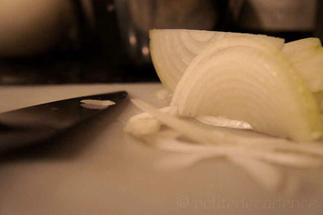 Yesterday I came home and popped into my laptop Rossini’s Barbieri di Seviglia (I know, I’m getting stranger by the day) and then set on to search for a classic french onion soup, which I did not have to do for long since Smitten Kitchen, as usual, had the answer for me quite soon. So I grabbed 4 big, shiny, smooth onions and set them on the chopping board. I grabbed the knife, I sliced once, I sliced twice. And then I stopped. What on earth was I thinking???? I’d completely forgotten that onions, or any of their cousins (red onions, shallots, garlic, spring onions, chives, you name it!) will have me in tears within seconds. And I’m not talking about watery eyes or a runaway tear. I’m talking grab-the-tissues-now stuff. I don’t know why so much, but it’s always been that way. I’ve tried super ultra sharp knives. I’ve tried cold onions straight from the fridge. There’s nothing that can help it. In fact, I remembered as I held the onion with great hatred in my hand and cried in between bouts of Figaro Figaro Figaro coming from my computer, when I worked in cooking school and I had to prepare for recipes which included onions, I would always trade with the other assistants for anything else. I’d much prefer to remove the scales from your smelly fish! So why would I subject myself willingly to all that slicing of the stinky critter?? The reason, of course, is that there is nothing quite like french onion soup. Even if I had to eat it with puffy eyes and a red nose. Deb uses Julia Child’s recipe, which she kindly provides with friendly measures. The only thing I changed was the bread, which I changed for American pumpernickel since I didn’t have any other, but it was actually an incredibly good twist. The caraway seeds such a pleasant surprise in the hot, caramelized goodness of the onions.