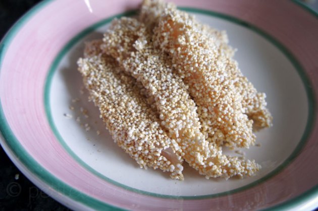 Now imagine fish sticks coated in this delicious grain, which not only absorbs less fat when frying, it’s also incredibly rich in flavor and nutrients, such as A, B, C, B1, B2, B3 vitamins, calcium, iron, phosphorus and folic acid. It contains much more protein than other cereals; twice as much as rice, and over 70% more than wheat. And imagine those fish stick sitting on top of a delicious broccoli, wilted arugula, and goat cheese salad. Sounds delicious and nutritious? On to the recipe then (It’s quick and easy, too!):