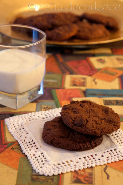 So I’ve got everything I love: my (very soft and lovable) dog is sitting beside me, it’s raining outside, I’m listening to Stacey Kent, and I’ve got a glass of insanely good wine right next to my computer. Does it get better than that? Mmmm…yes. I also just ate some of the most chocolatey-rich-gooey-intense-cookies I’ve ever made (Can’t say the best ever because that doesn’t really exist. All home made cookies are equally great in the eyes of god just for being cookies. Ahem) with a glass of cold milk. There really is nothing that could top that right? Except maybe two chocolate cookie recipes all in one post. Yup, two. And they couldn’t be more different from one another. Let me tell you about the first one. It’s a a recipe of my own which I can dare to call the perfect cookie to accompany your espresso. A rich in cocoa chocolate shortbread topped by a thick layer of white chocolate, the ideal combo of sweet and chocolate-y, just what you want after a long sip of good dark coffee, right? And not only that, they’re lovely looking AND easy to make. And they keep for more than two weeks. (can’t tell you how much longer because I’ve never actually been able to have shortbread lying around uneaten for that long). Just what you need when you have company over for coffee, trust me. And the second recipe: double chocolate cookies which are gooey inside, crumbly outside, warm from the oven and have to be had with a glass of really cold milk? Yes, a dozen please. That recipe comes courtesy of Kim at Strawberry Ginger, a great blog with tons of delicious recipes. This double choc recipe is one of the best I’ve tried, or at least they turned out really well for me! I highly recommend warming them slightly in your toaster oven before eating them, the chocolate chips will melt blissfully in your mouth. But enough talk about chocolate, go read the recipes.