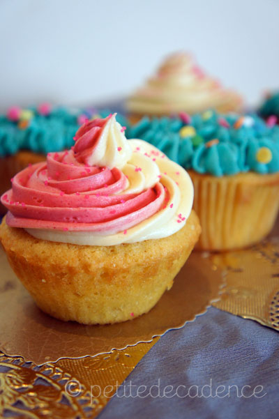 That being said though….cupcakes are incredibly cute and fun to make…they’re basically a pastry canvas in which you can go totally crazy decorating, and it’s not the serious undertaking of making say, a wedding cake…it’s just a teeny tiny cake which you can mess up without any serious consequences. The color, shape and flavor of the toppings are endless! So I guess in that part I can understand and get on board the cupcake mania. But since I didn’t want to go all out and make a huge mess of my kitchen (because everyone who decorates cakes know how many freaking utensils and surfaces get covered in sticky sugary stuff) I made a simple vanilla cupcake with buttercream frosting recipe! They actually took about an hour and a half all in all to make! Read more for the recipe.